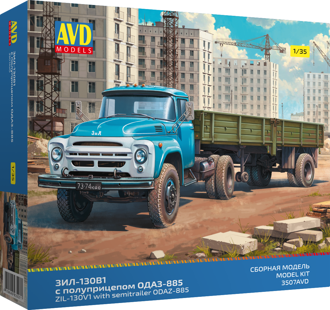 Сборная модель 1:35 Двухосный седельный тягач 4х2 ЗиЛ-130В1, ранняя облицовка радиатора, с одноосным бортовым полуприцепом ОдАЗ-885 (AVD Models)
