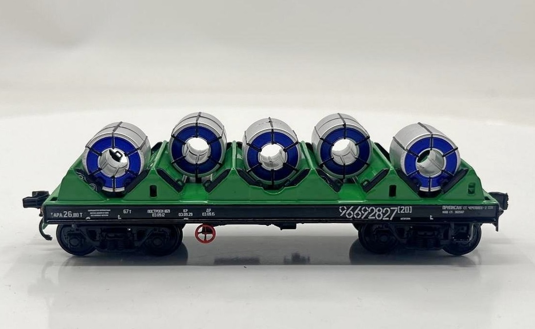 Коллекционная масштабная модель Четырехосный вагон-сталевоз 13-9906 (вагон для перевозки стали в рулонах), с журналом спецвыпуск №5 (Наши Поезда. Modimio)
